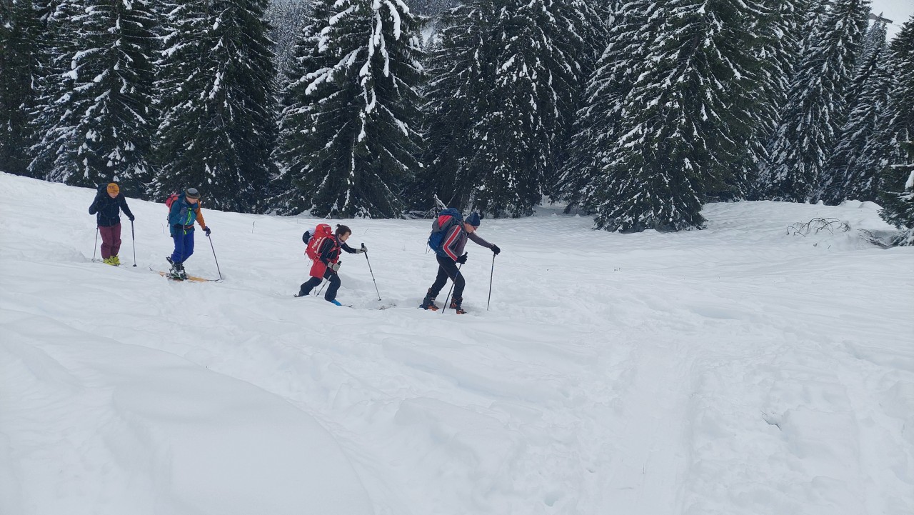 ...und haben ihn gefunden. Mit Bahn und Bus ging´s ins Spitzingskigebiet und über die schöne, ruhige Tourenabfahrt hinauf auf den Rosskopf. Von dort über die Piste (schon mit Skibetrieb) wieder ins Tal.